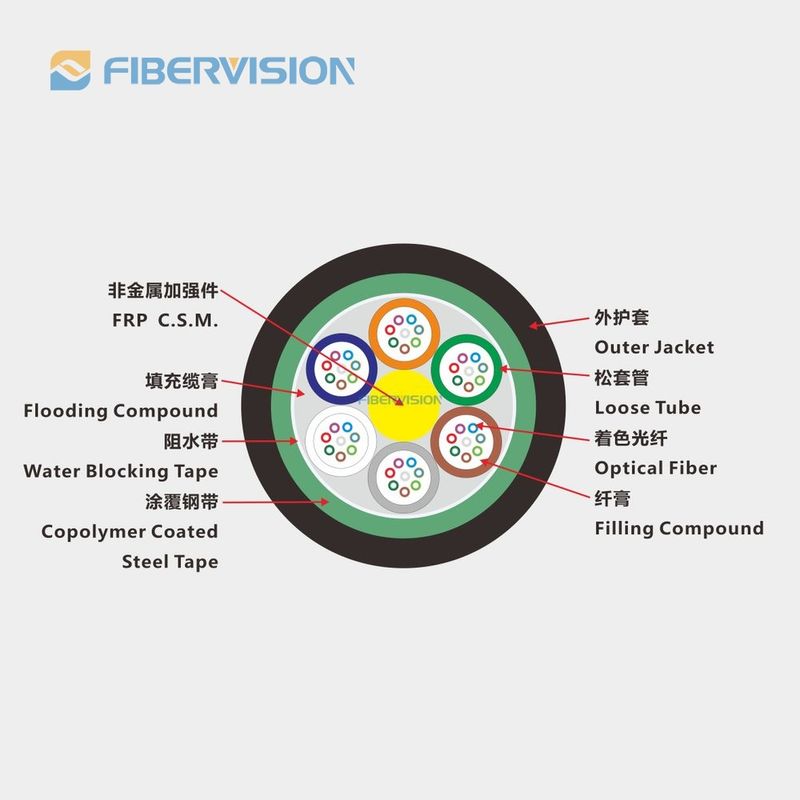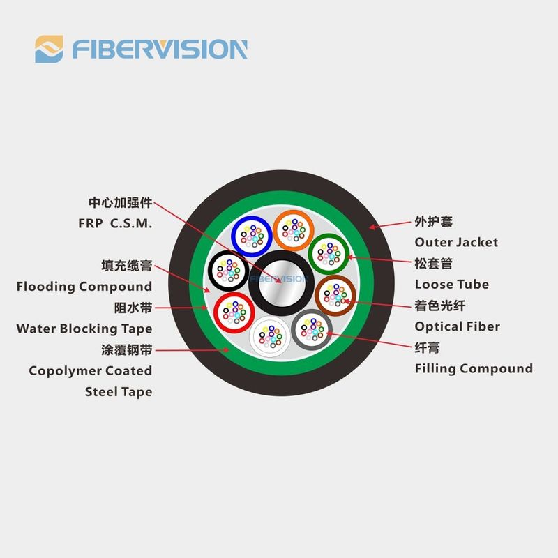 Metallic strength member,loose-tube stranded,gel filling,laminated corrugated steel tape-polyethylene sheath outdoor cable for communication purpose.